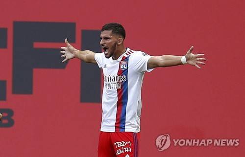 epa09543119 Houssem Aouar of Olympique Lyon celebrates after scoring the 2-0 lead during the French Ligue 1 soccer match between OGC Nice and Olympique Lyon in Nice, France, 24 October 2021. EPA/SEBASTIEN NOGIER