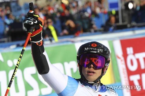 Switzerland's Gino Caviezel celebrates after crossing the finish line during an alpine ski, men's World Cup giant slalom, in Soelden, Austria, Sunday, Oct. 24, 2021. (AP Photo/Marco Trovati)