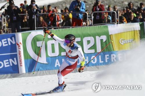 Switzerland's Gino Caviezel celebrates after crossing the finish line during an alpine ski, men's World Cup giant slalom, in Soelden, Austria, Sunday, Oct. 24, 2021. (AP Photo/Marco Trovati)