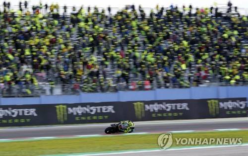 Italian rider Valentino Rossi of the Petronas Yamaha SRT steers his motorcycle past his fans during the MotoGP race of the Emilia Romagna Motorcycle Grand Prix at the Misano circuit in Misano Adriatico, Italy, Sunday, Oct. 24, 2021. (AP Photo/Antonio Calanni)