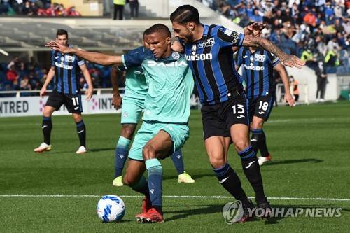 epa09543124 Udinese's Rodrigo Becao (L) and Atalanta's Giuseppe Pezzella in action during the Italian Serie A soccer match between Atalanta BC and Udinese Calcio at the Gewiss Stadium in Bergamo, Italy, 24 October 2021. EPA/PAOLO MAGNI