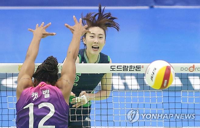 (서울=연합뉴스) 24일 경기도 수원실내체육관에서 열린 도드람 2021-2022 V리그 현대건설과 흥국생명의 경기에서 현대건설 황민경이 공격을 시도하고 있다. 2021.10.24