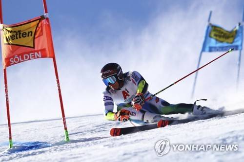 Slovenia's Zan Kranjec speeds down the course during an alpine ski, men's World Cup giant slalom, in Soelden, Austria, Sunday, Oct. 24, 2021. (AP Photo/Marco Trovati)