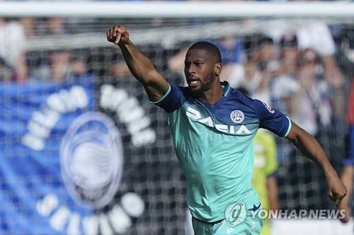 Udinese's Beto celebrates after scoring his side's first goal and final equalizer during the Italian Serie A soccer match between Atalanta and Udinese at the Gewiss Stadium in Bergamo, Italy, Sunday, Oct. 24, 2021. (Spada/LaPresse via AP) ITALY OUT;