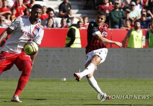 epa09543172 Youcef Atal (R) of Nice scores the 1-2 goal during the French Ligue 1 soccer match between OGC Nice and Olympique Lyon at the Allianz Riviera stadium in Nice, France, 24 October 2021. EPA/SEBASTIEN NOGIER