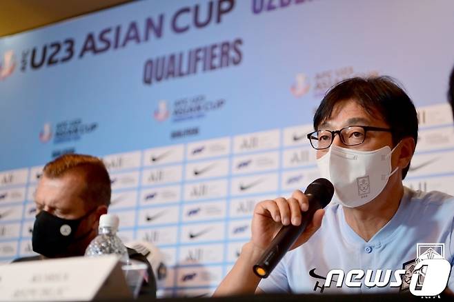(서울=뉴스1) = 황선홍 U-23(23세 이하) 대표팀 감독이 24일 싱가포르 머큐리록시호텔에서 열린 2022 아시아축구연맹(AFC) U-23 아시안컵 예선 공식 기자회견에서 질의에 답하고 있다.(대한축구협회 제공) 2021.10.24/뉴스1