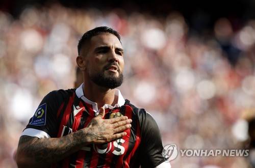 epa09543207 Andy Delort of OGC Nice celebrates after scoring the 2-2 goal during the French Ligue 1 soccer match between OGC Nice and Olympique Lyon at the Allianz Riviera stadium in Nice, France, 24 October 2021. EPA/SEBASTIEN NOGIER