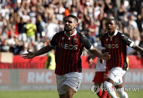 epa09543211 Andy Delort (L) of OGC Nice celebrates after scoring the 2-2 goal during the French Ligue 1 soccer match between OGC Nice and Olympique Lyon at the Allianz Riviera stadium in Nice, France, 24 October 2021. EPA/SEBASTIEN NOGIER