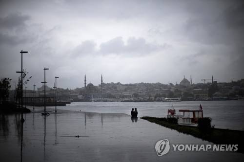 A couple sits in a promenade at the Bosphorus during a rainy day in Kadikoy pier, Istanbul, Turkey, Sunday, Oct. 24, 2021. (AP Photo/Francisco Seco)