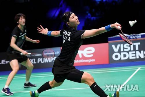 (211024) -- ODENSE, Oct. 24, 2021 (Xinhua) -- Lee So-hee/Shin Seung-chan (R) of South Korea compete during the women's doubles final between Lee So-hee/Shin Seung-chan of South Korea and Huang Dongping/Zheng Yu of China at the Victor Denmark Open 2021 in Odense, Denmark, Oct. 24, 2021. (Xinhua/Zhang Cheng)