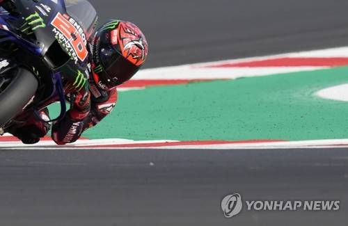 France's rider Fabio Quartararo of the Monster Energy Yamaha MotoGP steers his motorcycle during the MotoGP race of the Emilia Romagna Motorcycle Grand Prix at the Misano circuit in Misano Adriatico, Italy, Sunday, Oct. 24, 2021. (AP Photo/Antonio Calanni)