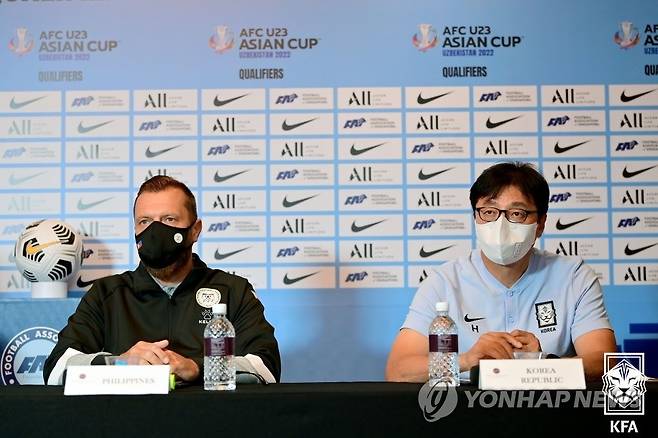 (서울=연합뉴스) 한국 남자 23세 이하(U-23) 대표팀 지휘봉을 잡은 황선홍 감독이 24일(현지시간) 싱가포르 머큐리록시호텔에서 열린 2022 아시아축구연맹(AFC) U-23 아시안컵 예선 공식 기자회견에서 취재진의 질문을 듣고 있다. 왼쪽은 필리핀 감독. 2021.10.24
