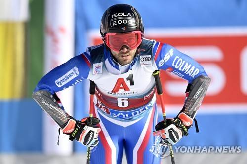 epa09543258 Mathieu Faivre of France reacts during the second run of the men's Giant Slalom at the FIS Alpine Skiing World Cup season opener on the Rettenbach glacier in Soelden, Austria, 24 October 2021. EPA/GIAN EHRENZELLER