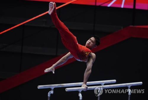 epa09543267 Xuwei Hu of China competes in the Men's Parallel Bars Final at the 50th FIG Artistic Gymnastics World Championships in Kitakyushu, Japan, 24 October 2021. EPA/KIMIMASA MAYAMA