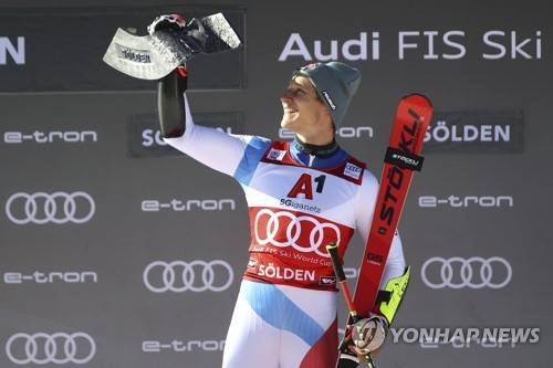 Switzerland's Marco Odermatt celebrates on the podium after winning an alpine ski, men's World Cup giant slalom, in Soelden, Austria, Sunday, Oct. 24, 2021. (AP Photo/Marco Trovati)