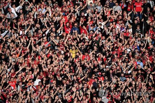epa09543261 Leverkusen supporters cheer on their team prior to the German Bundesliga soccer match between 1. FC Koeln and Bayer Leverkusen at Rheinenergiestadion in Cologne, Germany, 24 October 2021. EPA/SASCHA STEINBACH CONDITIONS - ATTENTION: The DFL regulations prohibit any use of photographs as image sequences and/or quasi-video.