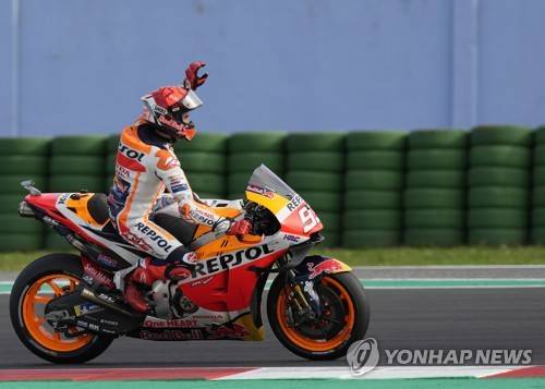 Spain's rider Marc Marquez of the Repsol Honda Team celebrates after winning the MotoGP race of the Emilia Romagna Motorcycle Grand Prix at the Misano circuit in Misano Adriatico, Italy, Sunday, Oct. 24, 2021. (AP Photo/Antonio Calanni)