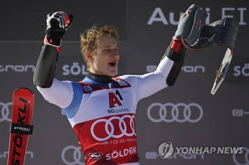 epa09543285 Marco Odermatt of Switzerland celebrates on the podium after winning the men's Giant Slalom at the FIS Alpine Skiing World Cup season opener on the Rettenbach glacier in Soelden, Austria, 24 October 2021. EPA/GIAN EHRENZELLER