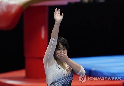 epa09543303 Mai Murakami of Japan reacts during the Women's Floor Final at the 50th FIG Artistic Gymnastics World Championships in Kitakyushu, Japan, 24 October 2021. EPA/KIMIMASA MAYAMA
