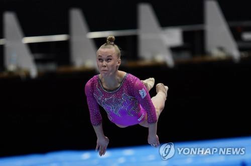 epa09543307 Angelina Melnikova of Russia in action during the Women?s Floor Final at the 50th FIG Artistic Gymnastics World Championships in Kitakyushu, Japan, 24 October 2021. EPA/KIMIMASA MAYAMA