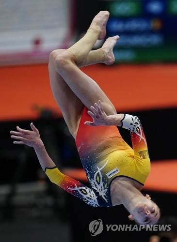 epa09543320 Maria Ceplinschi of Romania in action during the Women?s Floor Final at the 50th FIG Artistic Gymnastics World Championships in Kitakyushu, Japan, 24 October 2021. EPA/KIMIMASA MAYAMA