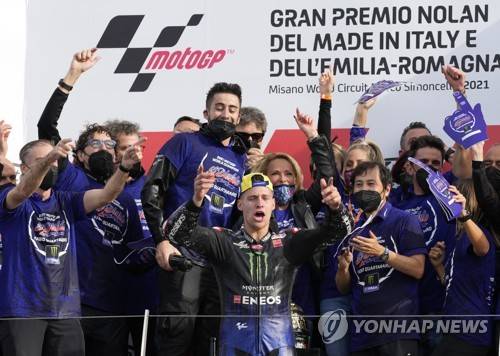 Moto GP World Champion France's rider Fabio Quartararo of the Monster Energy Yamaha MotoGP, front, celebrates on the podium with his team members after finishing fourth the MotoGP race of the Emilia Romagna Motorcycle Grand Prix at the Misano circuit in Misano Adriatico, Italy, Sunday, Oct. 24, 2021. (AP Photo/Antonio Calanni)
