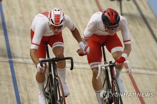 epa09543326 Riders of team Poland in action during the men's Madison 50km final at the UCI Track Cycling World Championships in Roubaix, France, 24 October 2021. EPA/YOAN VALAT