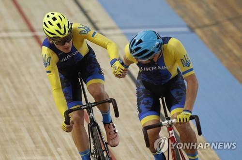 epa09543325 Riders of team Ukraine in action during the men's Madison 50km final at the UCI Track Cycling World Championships in Roubaix, France, 24 October 2021. EPA/YOAN VALAT