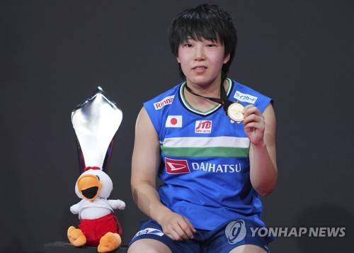 epa09543333 Winner Akane Yamaguchi of Japan celebrates on the podium of the women's singles competion at the Victor Denmark Open 2021 badminton tournament in Odense, Denmark, 24 October 2021. EPA/Claus Fisker DENMARK OUT