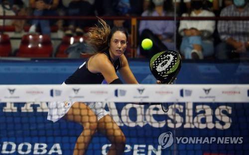 epa09543336 Gemma Triay of Spain in action with Alejandra Salazar against Ariana Sanchez and Paula Josemaria during their women's final at the Cervezas Victoria Cordoba Open 2021 as part of the World Padel Tour in Cordoba, southern Spain, 24 October 2021. EPA/Guillermo Salas