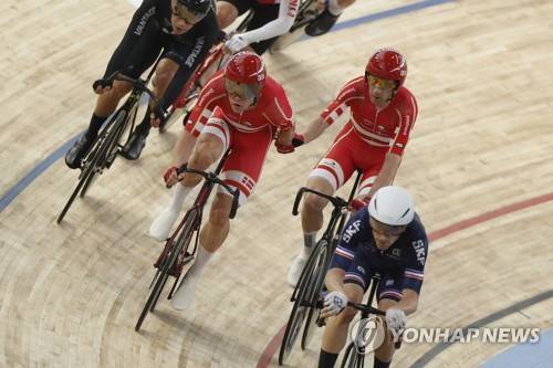 epa09543343 Riders of team Denmark in action during the men's Madison 50km final at the UCI Track Cycling World Championships in Roubaix, France, 24 October 2021. EPA/YOAN VALAT