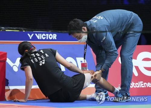 epa09543341 An Seyoung of Korea receives medical attention during the women's singles final match against Akane Yamaguchi of Japan at the Victor Denmark Open 2021 badminton tournament in Odense, Denmark, 24 October 2021. EPA/Claus Fisker DENMARK OUT