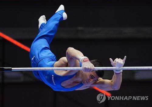 epa09543347 Carlo Macchini of Italy in action during the Men's Horizontal Bar Final at the 50th FIG Artistic Gymnastics World Championships in Kitakyushu, Japan, 24 October 2021.Ê EPA/KIMIMASA MAYAMA