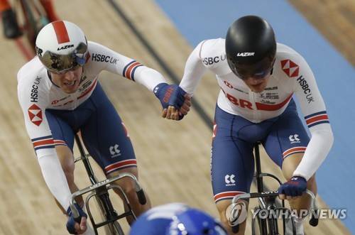 epa09543348 Riders of team Britain in action during the men's Madison 50km final at the UCI Track Cycling World Championships in Roubaix, France, 24 October 2021. EPA/YOAN VALAT