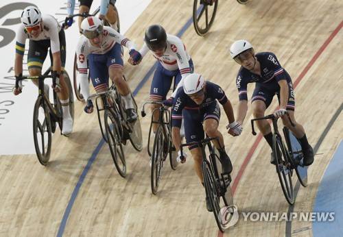 epa09543349 Riders of team Britain (C) and France (R) in action during the men's Madison 50km final at the UCI Track Cycling World Championships in Roubaix, France, 24 October 2021. EPA/YOAN VALAT