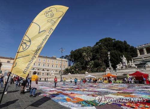 epa09543356 A charity rug sale organized by MAM Beyond borders in Popolo square, Rome, Italy, 24 October 2021. MAM Beyond borders is a volunteer Association for Vulnerable Social, Health and Humanitarian Support and Assistance. EPA/GIUSEPPE LAMI