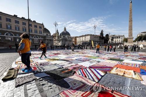 epa09543353 A charity rug sale organized by MAM Beyond borders in Popolo square, Rome, Italy, 24 October 2021. MAM Beyond borders is a volunteer Association for Vulnerable Social, Health and Humanitarian Support and Assistance. EPA/GIUSEPPE LAMI