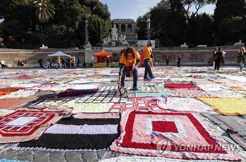 epa09543354 A charity rug sale organized by MAM Beyond borders in Popolo square, Rome, Italy, 24 October 2021. MAM Beyond borders is a volunteer Association for Vulnerable Social, Health and Humanitarian Support and Assistance. EPA/GIUSEPPE LAMI