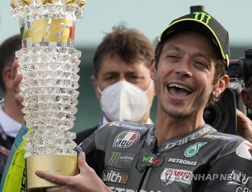 Italian rider Valentino Rossi of the Petronas Yamaha SRT poses with trophy after the MotoGP race of the Emilia Romagna Motorcycle Grand Prix at the Misano circuit in Misano Adriatico, Italy, Sunday, Oct. 24, 2021. (AP Photo/Antonio Calanni)