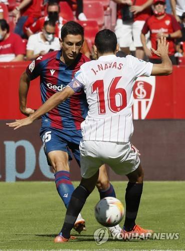 epa09543375 Sevilla's Jesus Navas (R) in action against Levante's Pablo Martinez (L) during the Spanish LaLiga soccer match between Sevilla FC and Levante UD at Sanchez Pizjuan stadium in Seville, Spain, 24 October 2021. EPA/Jose Manuel Vidal