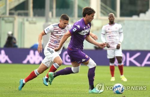 epa09543387 Fiorentina's forward Dusan Vlahovic (R) vies for the ball with Cagliari's midfielder Razvan Marin (L) during the Italian Serie A soccer match between ACF Fiorentina and Cagliari Calcio at the Artemio Franchi stadium in Florence, Italy, 24 October 2021. EPA/CLAUDIO GIOVANNINI