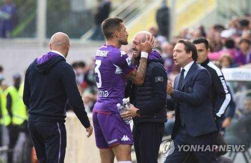 epa09543391 Fiorentina's midfielder Cristiano Biraghi (C-L) celebrates with his head coach Vincenzo Italiano (C-R) after scoring a goal during the Italian Serie A soccer match between ACF Fiorentina and Cagliari Calcio at the Artemio Franchi stadium in Florence, Italy, 24 October 2021. EPA/CLAUDIO GIOVANNINI