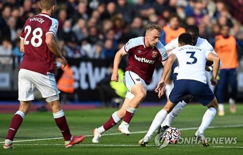 epa09543400 West Ham United's Jarrod Bowen vies for the ball with Tottenham's Sergio Reguilon (R) during the English Premier League soccer match between West Ham United and Tottenham Hotspur at the London Stadium in London, Britain, 24 October, 2021. EPA/ANDY RAIN EDITORIAL USE ONLY. No use with unauthorized audio, video, data, fixture lists, club/league logos or 'live' services. Online in-match use limited to 120 images, no video emulation. No use in betting, games or single club/league/player publications.