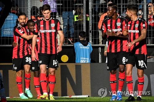 epa09543404 Leverkusen's Karim Bellarabi (L) celebrates with his teammates after scoring the 2-0 lead during the German Bundesliga soccer match between 1. FC Koeln and Bayer Leverkusen at Rheinenergiestadion in Cologne, Germany, 24 October 2021. EPA/SASCHA STEINBACH CONDITIONS - ATTENTION: The DFL regulations prohibit any use of photographs as image sequences and/or quasi-video.