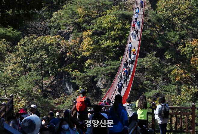 맑은 날씨를 보인 24일 휴일 나들이를 나온 시민들이 경기 파주시 감악산 출렁다리를 건너며 깊어가는 가을을 만끽하고 있다.