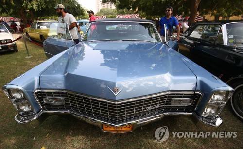epa09543439 A frontal view of a vintage Caddilac on display during a show organized by the Vintage and Classic Car Club of Pakistan, in Karachi, Pakistan, 24 October 2021. More than 60 vintage and classic cars were on display, some coming all the way from across the country, others from Karachi and all heading on to Khyber. EPA/SHAHZAIB AKBER