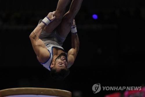 Andrey Medvedev, of Israel, competes in the vault during the men's apparatus finals of the FIG Artistic Gymnastics World Championships in Kitakyushu, western Japan, Sunday, Oct. 24, 2021. (AP Photo/Hiro Komae)