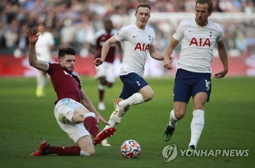 Tottenham's Oliver Skipp, centre, and Tottenham's Harry Kane, right, challenge for the ball with West Ham's Declan Rice, left, during the English Premier League soccer match between West Ham United and Tottenham Hotspur at the London stadium in London, England, Sunday, Oct. 24, 2021. (AP Photo/Ian Walton)