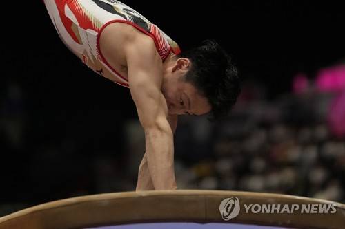 Hidenobu Yonekura, of Japan, competes in the vault during the men's apparatus finals of the FIG Artistic Gymnastics World Championships in Kitakyushu, western Japan, Sunday, Oct. 24, 2021. (AP Photo/Hiro Komae)