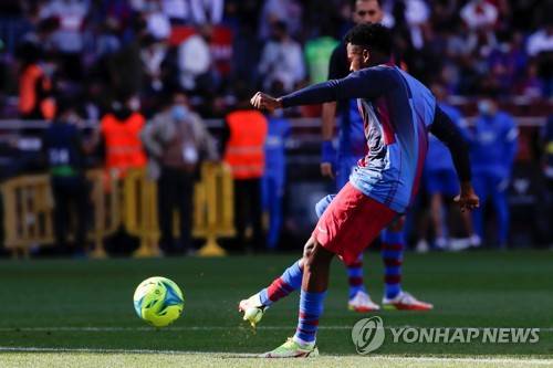 epa09543465 FC Barcelona's striker Ansu Fati warms up before the Spanish LaLiga soccer match between FC Barcelona and Real Madrid at Camp Nou stadium in Barcelona, Catalonia, Spain, 24 October 2021. EPA/Alberto Estevez